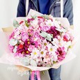 Розовый букет хризантем, роз и эустом