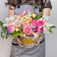 8 розовых хризантем в корзине