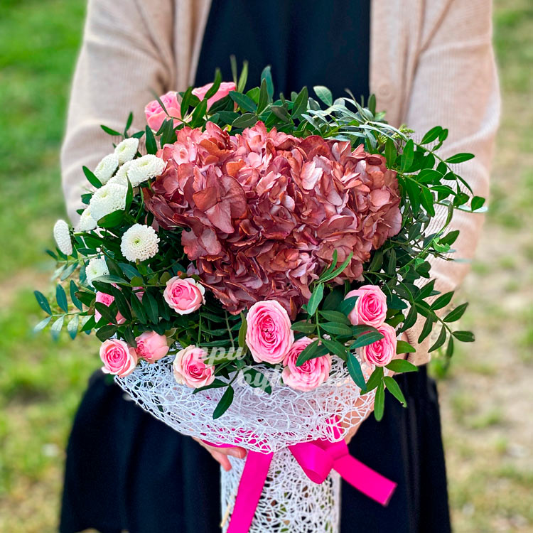 Бордовая гортензия с розовыми розами