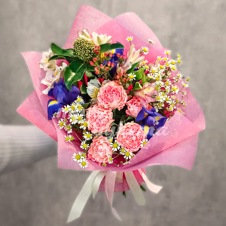 Букет из розовых гвоздик и ирисов