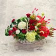 Кашпо бордовых, розовых и оранжевых роз