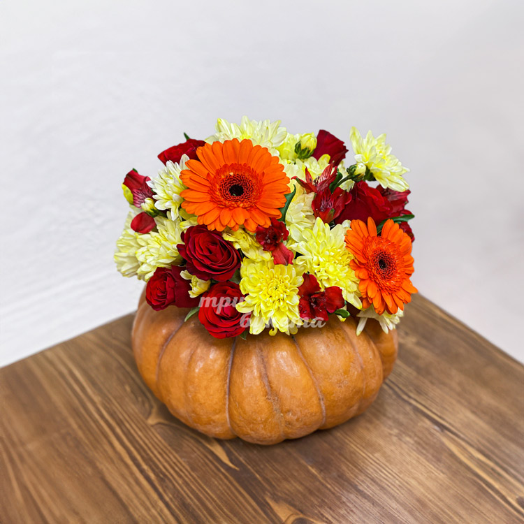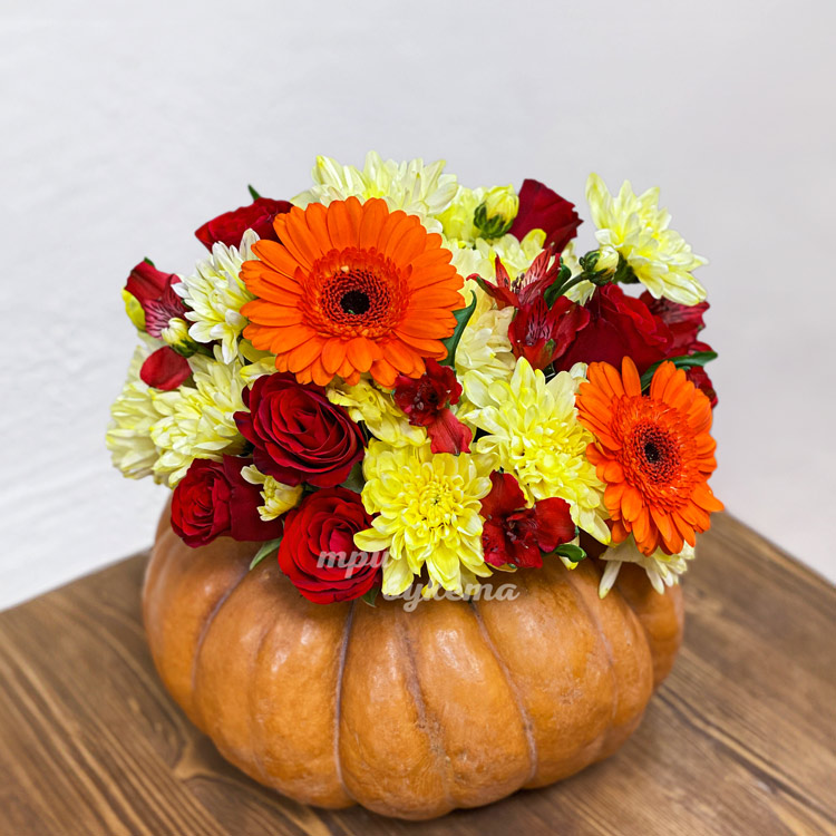 Композиция гербер, хризантем и роз в тыкве