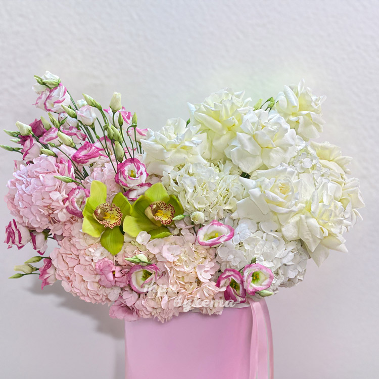 Коробка гортензий, эустом и французских роз