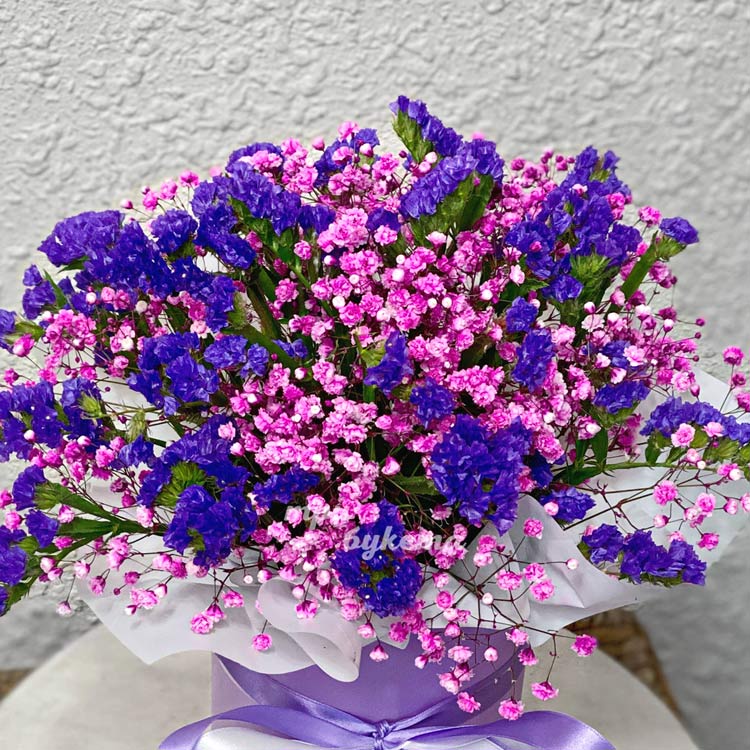 Коробочка с розовой гипсофилой и статицей