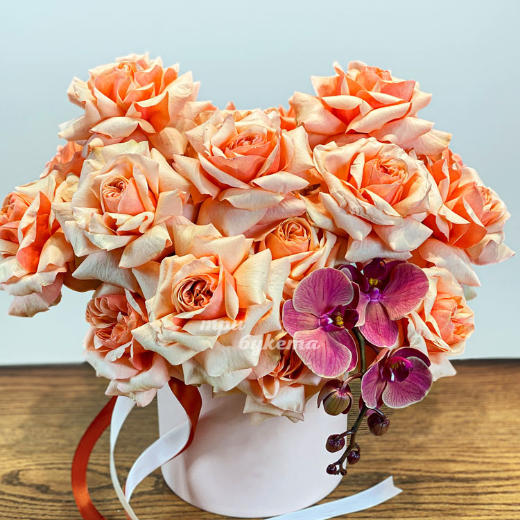 Шляпная коробка роз Шиммер с орхидеями